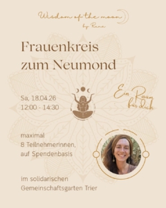 Am Samstag, dem 18.04.26 von 12 bis 14:30 Uhr findet ein Frauenkreis mit Runa statt. Es können maximal 8 Teilnehmerinnen mitmachen. Es wird um Anmeldung gebeten: 0176 666 99 702. Die Veranstaltung ist auf Spendenbasis.